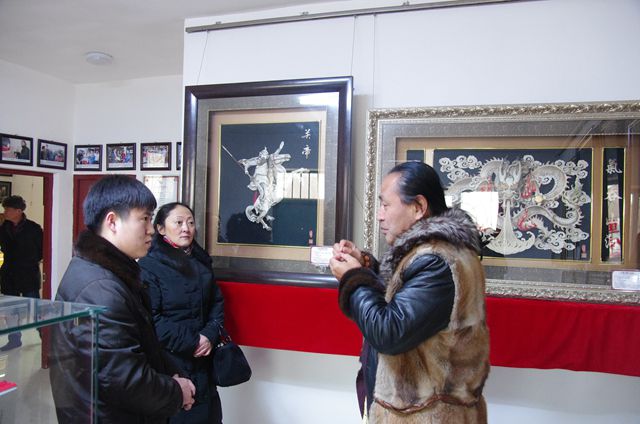 郭主席一行先来到了哲艺堂鱼皮画画廊,中国民族画院特聘画家,工艺美术大师,省级赫哲族鱼皮画传承人解永亮热情的给大家介绍鱼皮画,王立鹏老师从艺术家视角给鱼皮画传承人解永亮提出了发展建议,鼓励他要挖掘最具民俗的、民族的、原生态的艺术作品,从工艺美术领域升华到艺术创造领域,更好完成赫哲族鱼皮画传承的使命,并表示可以为鱼皮画的对外传播发挥作用。随后,大家来到了敖其雪村,欣赏敖其雪景。黑龙江鼎业房地产开发有限公司董事长吕学海先生和郊区侨联副主席宋国华一同陪同参观 。