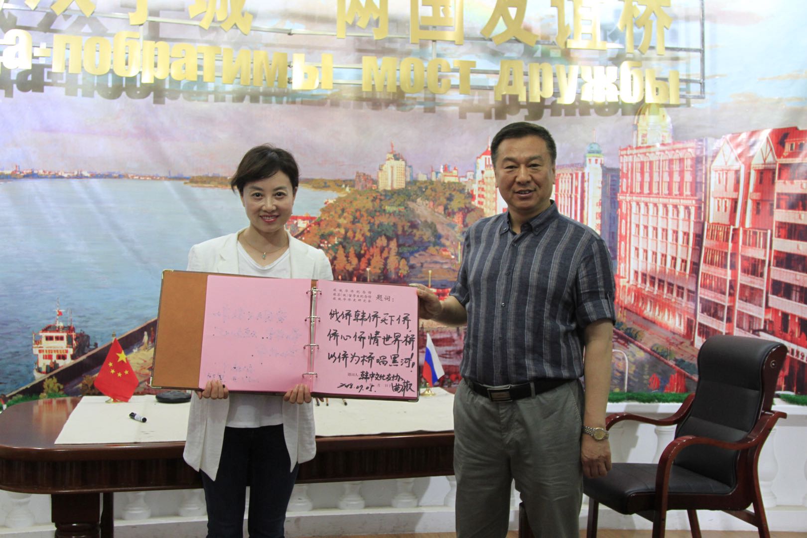 在参观结束时,曲欢为纪念馆题词:俄侨韩侨天下侨,侨心侨情世界侨,以侨为桥唱黑河!