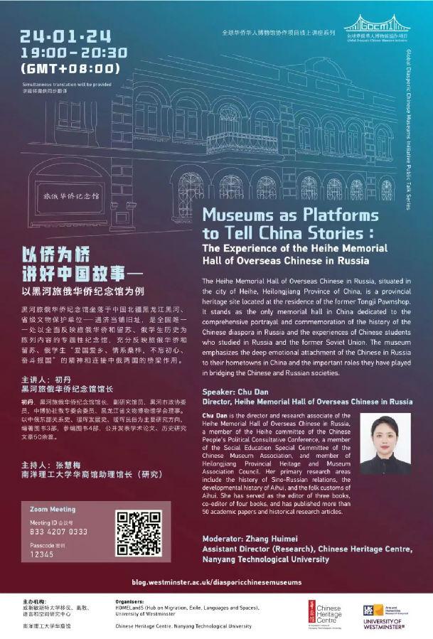 1月24日,全球华侨华人博物馆协作项目线上讲座系列举行了第五讲,黑河旅俄华侨纪念馆馆长初丹主讲,主持人是南洋理工大学华裔馆助理馆长张慧梅。讲座以中文进行,并提供了英文同步翻译。