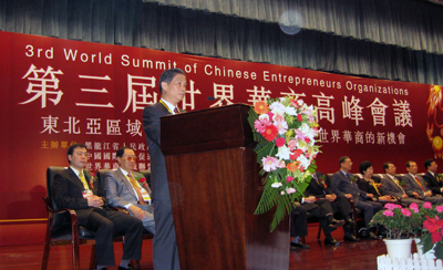 来自世界26个国家和地区的86个华商经贸社团组织的领袖和400多名华商企业家出席本次盛会,这次大会是由省政府、中国贸易促进会、世界华商组织联盟共同主办的,这是世界华商组织联盟成立以来,首次在中国内陆省份举办这一峰会。会议的主题是:东北亚区域合作与大中华经济圈--世界华商的新机会。会议旨在使世界各地华商统一思想、团结协作、密切各地华商之间的合作,不断完善世界华商组织联盟的组织建设,以利于促进大中华经济圈的形成。省委书记、省人大常委会主任钱运录,省委副书记、省长张左己,省政协主席王巨禄,中国贸促会会长万季飞,国务院台湾事务办公室副主任李炳才,世界华商组织联盟执行主席丁楷恩,台湾中华经济研究院董事长萧万长等出席大会。大会在歌曲《华商颂》中拉开序幕,中国国际贸易促进会会长万季飞致开幕词。